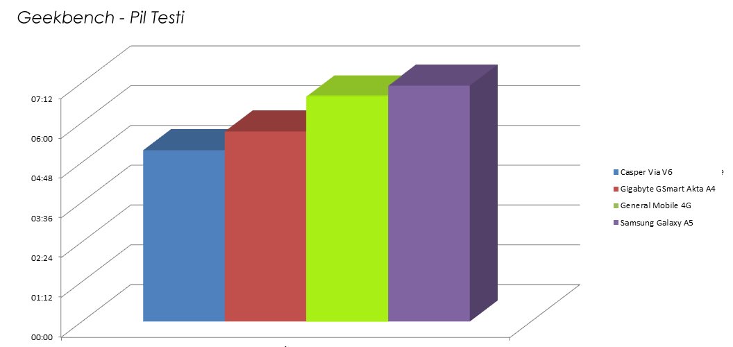 General Mobile 4G, pil kapasitesiyle bize 2500 mAh sunuyor. Casper VIA V6 ve Samsung Galaxy A5'in batarya kapasitesinden geniş olan batarya, günü çıkartabilecek bir performans sergiliyor. Geekbench'te uyguladığımız pil testinden 6 saat 47 dakikayla ayrılan telefon, bu bağlamda iyi seviyede olduğunu gösteriyor.