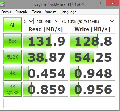 Gigabyte P27G'de 1 TB'lık diskin bulunduğunu söylemiştik. Ona da yazma ve okuma testleri uyguladık. Aldığımız sonuçlar tatmin edici düzeyde.