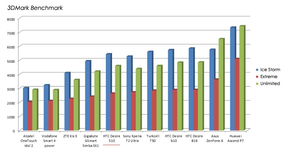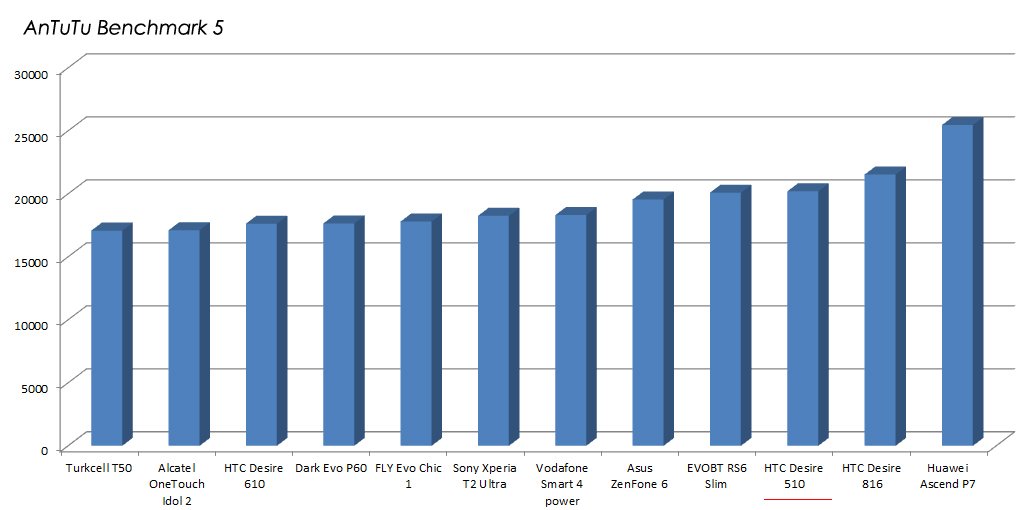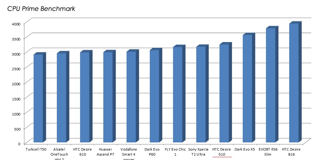 Desire 510'un performans test notlarına değinelim. Cep, performansıyla Desire 610 ve 816'dan çok da fark yaratır sonuçlar almıyor. AnTuTu testinden 20196 puan alan Desire 510, orta segmentte yer alan diğer cepler arasında iyi seviyede görünüyor. Sony Xperia T2 Ultra, Asus ZenFone 6, Desire 816, ve Huawei Ascend P7 gibi farklı ekran büyüklüklerine sahip ceplerle AnTuTu sonucuna göre aynı paydada olan telefon, CPU Prime Benchmark'ta ise 3254 puan alıyor. Test sonuçlarını sizinle paylaşıyoruz.