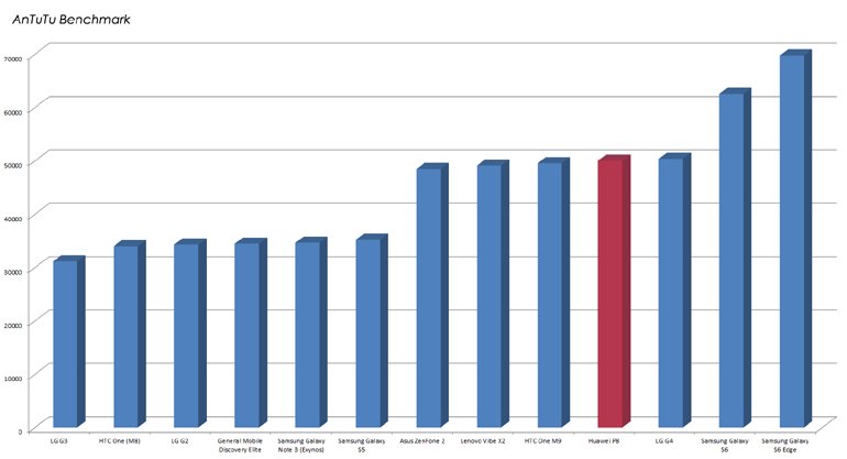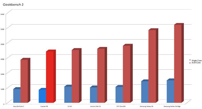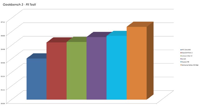 Pil yönetimi konusunda One M9'dan daha iyi durumda olan Huawei P8, yaptığımız Geekbench 3 pil testinde 5 saat 37 dakikayı gördü. Bu da onu yaklaşık 6 – 7 saatlik Galaxy S6 performansının peşinden ikinci sıraya yerleştiriyor.