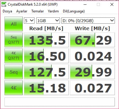 Bizim CrystalDiskMark raporumuza göre DataTraveler 50 bundan biraz daha iyi sonuç verdi. Aldığımız rapora göre, saniyede 127.5 MB sıralı okuma performansı gösterebilen bellek, 29.99 MB de yazma sonucu veriyor.