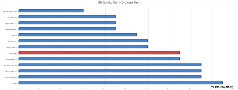 Öte yandan her zaman uyguladığımız 90 dakikalık Full HD video testimizi bu telefona da uyguladık. Tam ekran parlaklığında ve Wi-Fi'ya bağlı konumda ölçtüğümüzde, 1.5 saatlik süre sonunda telefonun yüzde 15 pil kaybettiğini gördük. Bu da ortalama bir değer olurken, Find X2'yi diğer modellerle yan yana koyduğumuzda, kendine orta sıralarda yer buluyor.
