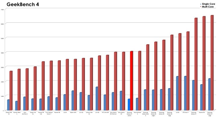 Geekbench 4'e geldiğimizde tek çekirdek skoruyla 773, çoklu çekirdek kullanımı sonucu ise 4071 puanlarını alan Galaxy A7, Sony Xperia Z5 ve Asus Zenfone 3 arasında kendine yer buluyor. Bu testte önemli bir detay, şu an 2149 TL'ye satışta olan Huawei P9'un, Galaxy S7 ve S7 edge'le birlikte zirvede oturması. Burada Galaxy A7, fiyatıyla Huawei P9'dan daha pahalı olduğunu ve S7 ile ise 300 TL'lik bir fark yarattığını hatırlatmak gerekiyor.