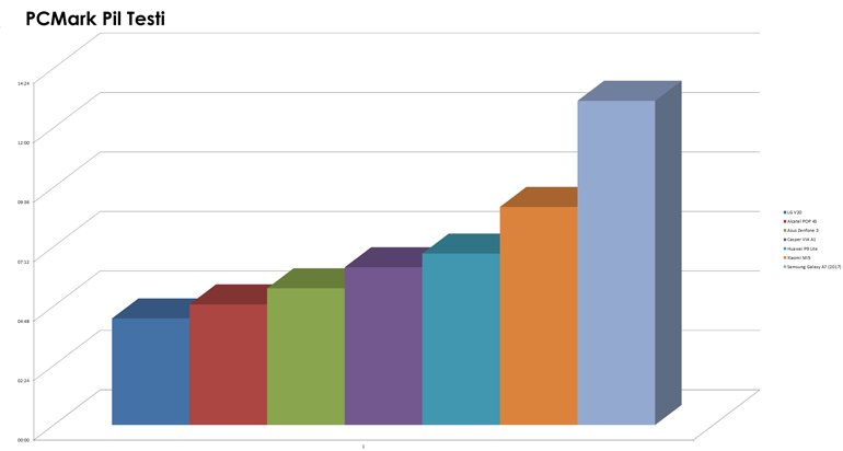 Peki, telefonun pil performansı nasıl? PCMark Work 2.0 testinde 13 saat 5 dakikalık bir sonuç alan Galaxy A7, bu skorla sınıfı için etkileyici bir sonuç alıyor. Bu sonuçla, LG V20, Alcatel POP 4S, Asus Zenfone 3, Casper VIA A1, Huawei P9 Lite ve Xiaomi Mi5'ten daha iyi grafik üreten Galaxy A7, 3600 mAh kapasitesindeki bataryasının avantajından faydalanıyor. Öte yandan Lenovo P2'nin 5100 mAh bataryasıyla bu testten 18 saat 38 dakikalık bir sonuçla ayrıldığını da söyleyelim. Bu arada Lenovo P2'nin detaylı incelemesini birkaç gün içinde sizlerle paylaşacağız; şu an son testleri yapıyoruz.