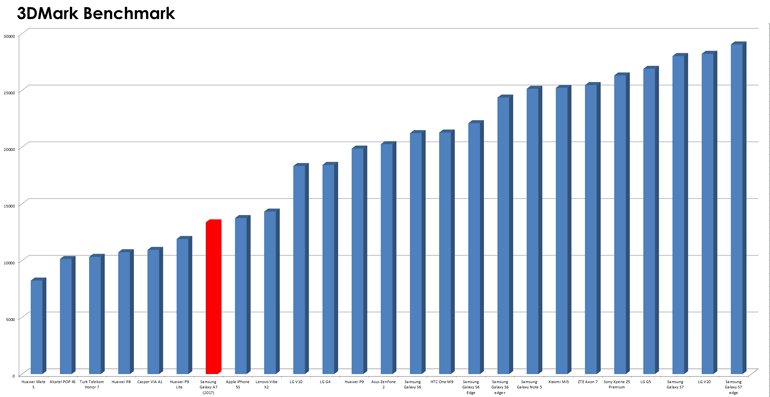Grafik kısmına geldiğimizde 3DMark Benchmark'tan Ice Storm'da 12082, Extreme'de 11442 ve Unlimited'ta ise 13359 puanlarını alan Galaxy A7'nin, bu test sonucunda Casper VIA A1 ve Huawei P9 Lite'dan az farkla önde durduğunu görüyoruz. Bu arada yine telefonun Epic Citadel'de Full HD çözünürlükte 54 FPS ürettiğini gördüğümüzü de söyleyelim.
