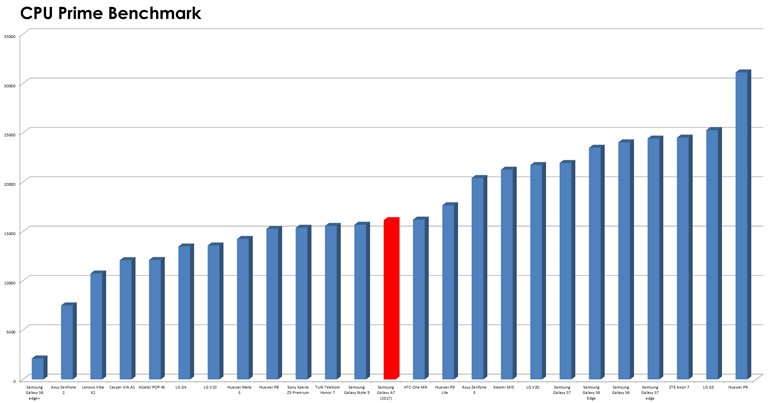 İlk olarak AnTuTu Benchmark'tan başlayalım. Bu testten 60176 puan alan Galaxy A7, bu puanla orta segment cepler için iyi bir performans ortaya koyuyor, ayrıca geçtiğimiz yılın amiral gemileriyle yakın bir çizgide duruyor. Huawei P9 Lite ile Galaxy S6 arasında yer alan telefonu CPU Prime Benchmark'ta da değerlendirdik.
