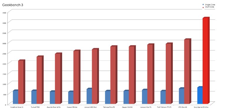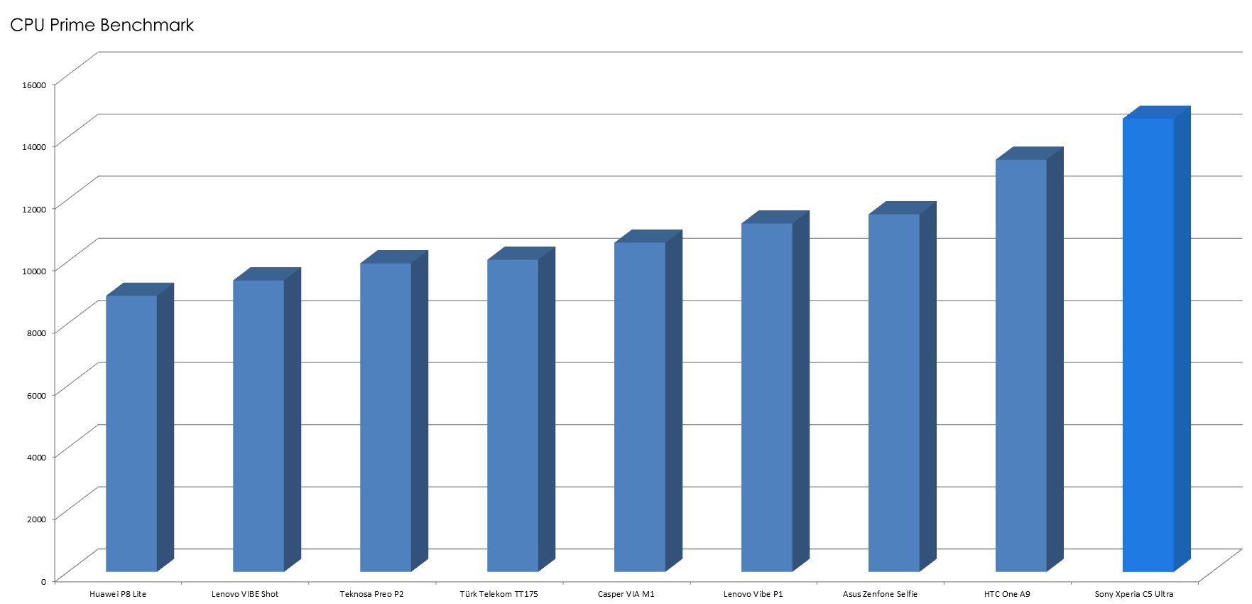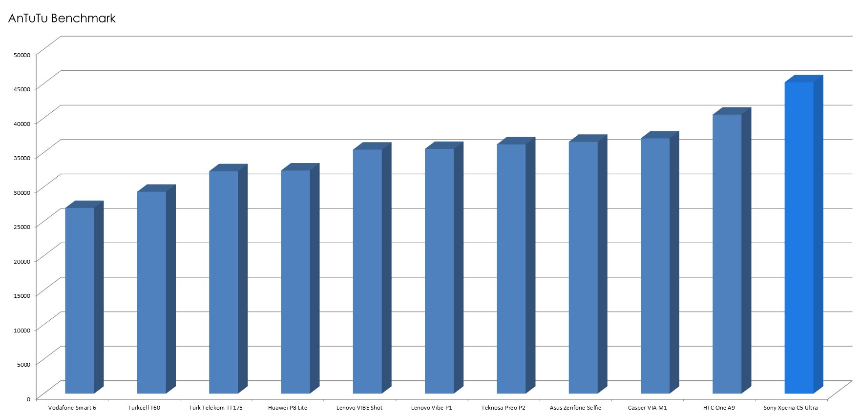 Xperia C5 Ultra, 8 çekirdekli MediaTek işlemciden güç alıyor. MT6752 yongasını üzerinde taşıyan telefon, Snapdragon 615'li modellerle rekabet içinde. İşlemci bazında karşılaştırma yaptığımızda, MT6752'nin biraz farkla Snapdragon 615 platformunu geride bıraktığını görebiliyoruz. Bunu zaten C5 Ultra'ya uyguladığımız sentetik test sonuçlarında da göreceğiz.