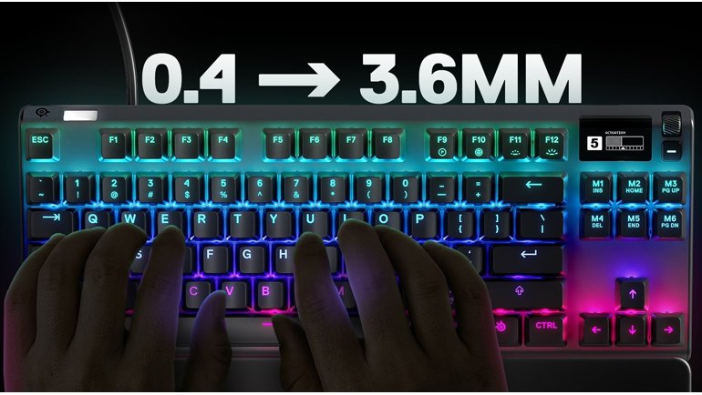 SteelSeries Apex Engine üzerinden klavyenin ¾'ünü kaplayan bu tuşların hassaslıkları tek tek (tekrar yazıyorum, tek tek) ayarlanabiliyor. 0.4mm'den 3.6mm'ye kadar dilediğiniz hassasiyete ayarlanabilen bu tuşlar sayesinde oyunlarda yüksek performans alıp yazı yazarken azap çekme dönemi resmen sona ermiş durumda. Bir adet hassaslığı düşük yazı yazma ve günlük çalışma profili, bir adet de rekabetçi oyunlara tanımlı, yüksek hassaslıktaki profili klavyeye kaydedebiliyorsunuz. Klavye üstündeki OLED ekrandan profiller arası geçiş yapmanız 5-6 saniye sürüyor.