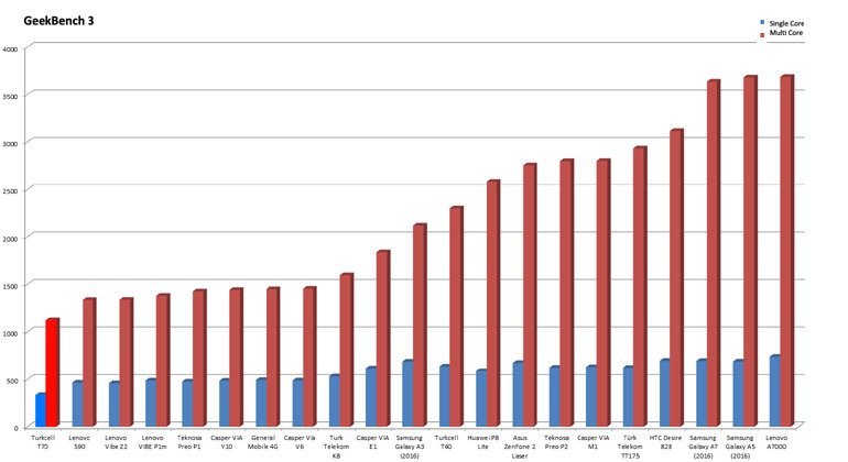 Turkcell, selef model T60'ta bizlere Snapdragon 615 işlemci sunmuştu. Bu işlemci o dönemin orta segment telefonlarında popüler olarak kullanılıyordu. Ancak elimizde T70 modeli, işlemcisiyle daha çok giriş segmente konumlanıyor. Zira telefonun işlemci hanesinde 8809 model numarasıyla da bilinen Qualcomm Snapdragon 210 yonga seti bulunuyor. Bu işlemcisiyle bizlere 1.3 GHz frekans bandında performans vadeden telefonun 4 çekirdekli bu işlemcisine Adreno 304 grafik birimi eşlik ediyor.