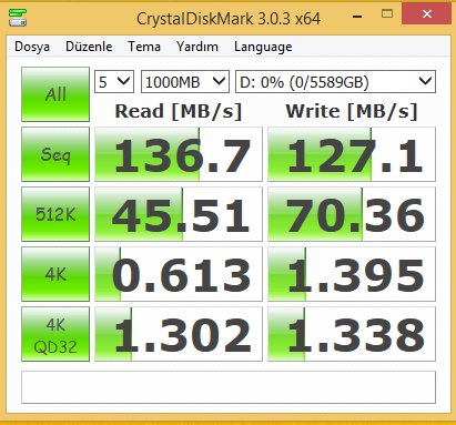 Green 6 TB'ın performans notlarından da bahsedelim. Elbette diskin önceliğinin düşük enerji tüketimi olması, performans noktasında kendini gösteriyor. Aldığımız CrystalDisk Benchmark sonuçlarına göre disk sıralı okumada saniyede 136 MB'a ulaşırken, sıralı yazmada ise saniyede 127 MB'ı görüyor. Bu değerler daha önce incelediğimiz, serinin yüksek performans gösteren ve NAS sistemlerine uygun olan Red Pro modelinde ise 182 MB ile 177 MB idi.