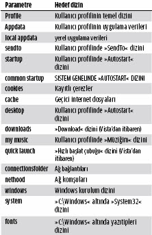 Pratik: shell komutu otomatik olarak dizin yapısı içerisindeki dizinlerin kısmen farklı kayıt yerlerini dikkate alır. Böylece güvenilir olarak istediğiniz dizine, mesela tanıdık birine PC'sinin konfigürasyonunda yardımcı olsanız ve burada kendi Windows sürümünüzden farklı bir sürümle karlılaşsanız bile, geçebilirsiniz. Sağ sayfadaki tabloda yaygın olarak kullanılan sistem dizinleri için komutları görebilirsiniz.